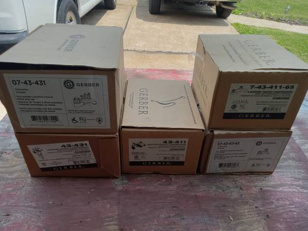 Gerber 2 - handle bath sink faucets Model# 43-411-65 - 2 sets Model# 43-411 - 1 set Model# 43-431 w/pop-up - 2 sets These would be great for a handyman or rental property owners Valued at over $100...