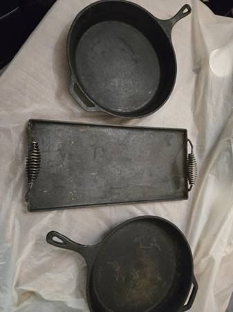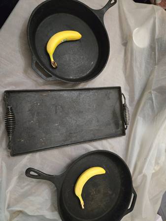 These are heavy! (Bananas for size comparison) Two 15" cast iron skillets nearly 3" deep Griddle surface is approx 24" × 10" Asking $30 each