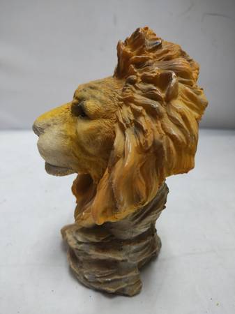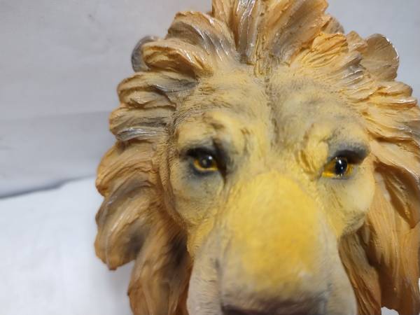 A free-standing resin sculpture of a male lion's head on a rock, with glass eyes. The mane, face, and muzzle are all detailed and lead to a dignified appearance in natural tawny shades of brown and yellow. The back of the sculpture is not the back of the lion's head, but rather an unfinished-looking concavity textured as though bits of resin were carved away. This is intentional in the design, as the carvings merge into the texture of the rock. The sculpture is lightweight and features metallic brushstrokes as highlights on the mane; the rest of the finish is matte.