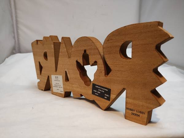MDF (medium density fiberboard) wooden decor piece spelling out "ROAR!" in orange, green, red, and blue. Spike accents on both "R"s, footprint-shaped hole in the "O".