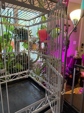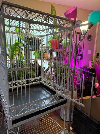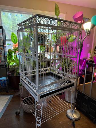 Bird cage for a large bird. Has a big door. Very sturdy. 24 x 24 x 31. 56 inches on stand with wheels.