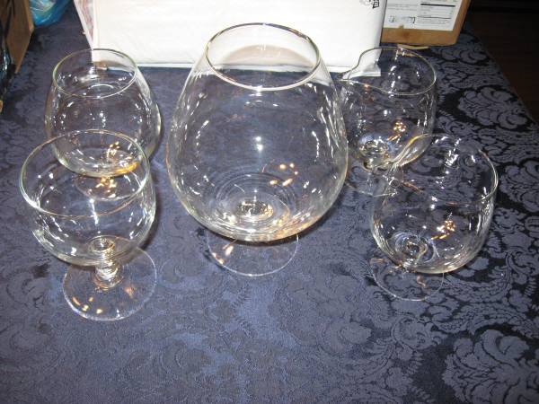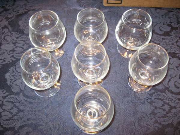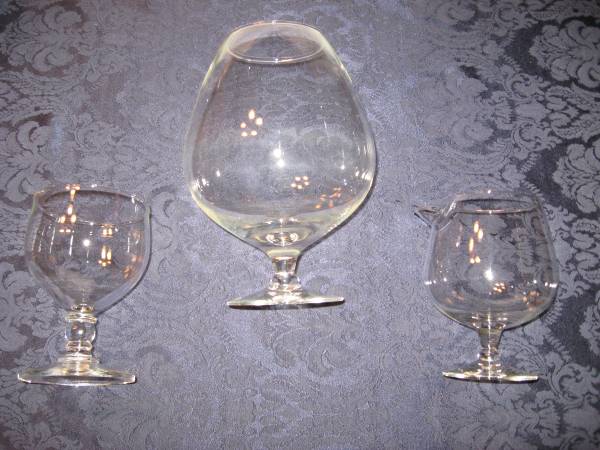 Lot of five larger brandy snifters. The smaller ones are approximately 5 3/4" tall and the larger one is 9" tall. Two of the smaller ones have pouring spouts. Plus seven 4" brandy snifters.