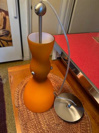 Sculptural shape is 13" tall, 6" wide at bottom opening. Includes brushed nickel ceiling plate, accents and finials. Translucent warm amber/orange color glass has matte finish outer, white glass inside.