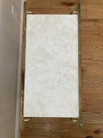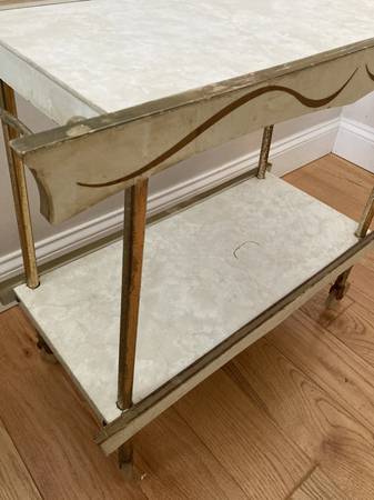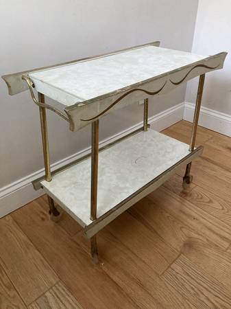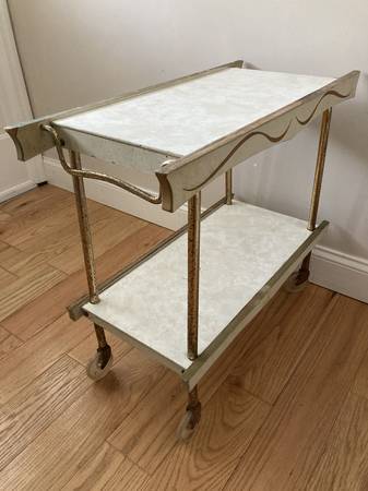 Mid Century Bar Cart Rolling Wooden Faux Marble Tops. The metal pieces are spotted with age. Wooden pieces have worn finish. Faux marble tops have few raised areas and a few scratches. Small piece missing on inside top extended trim. Sorry I didn't clean before photo's, dark curvy line on bottom shelf removable) I live close to south county mall in Oakville. I prefer text or call please, thanks.