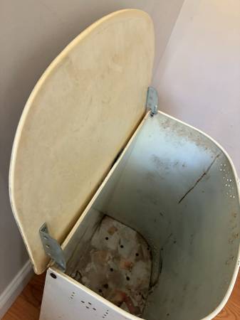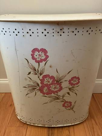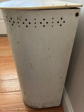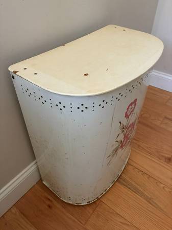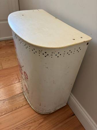 Mid Century Hamper Metal Hand Painted Hinged Lid. 24T x 20 3/4W x 11 7/8D. Hinged lid small piece missing and small chip missing on back left side. Lower metal lip has surface rust. Numberous spotting and few scratches and dent (lower right side). Inside wall surface rust and paper items (attached?) I live close to south county mall in Oakville. I prefer text or call, thank you.