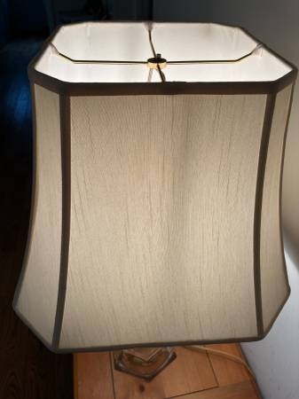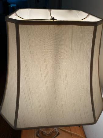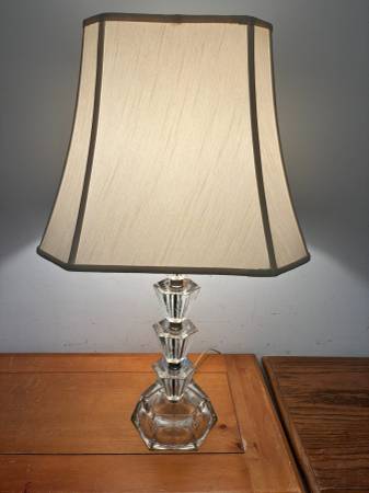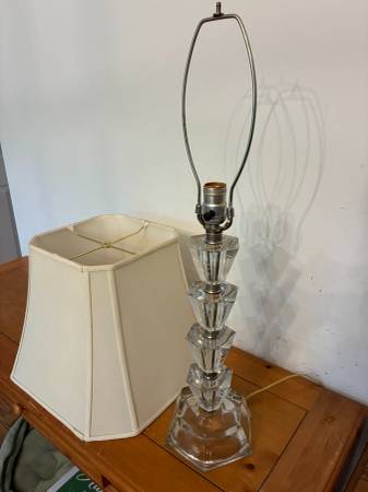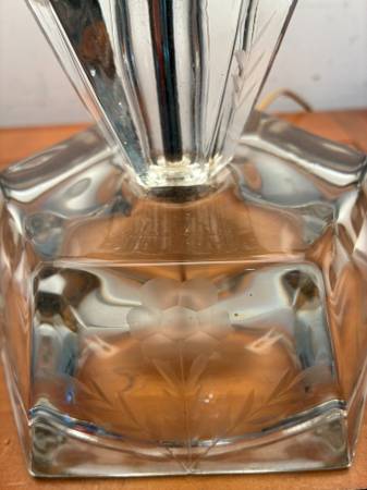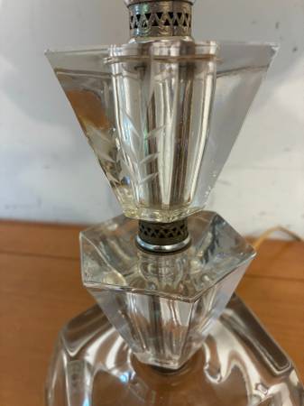 Mid Century Lamp /Light 5 Tiered Geometric Shapes Etched Glass. 14 3/16" Tall (to top of glass). 26" Tall to metal post. 5 3/4" Deep and 6 3/4" wide. Lightly etched floral pattern on glass and silver filigree between glass shapes. The shade has small water mark and little dirty top edge, the screw on top for shade is missing. I live close to south county mall in Oakville. I prefer text or call please, thanks.