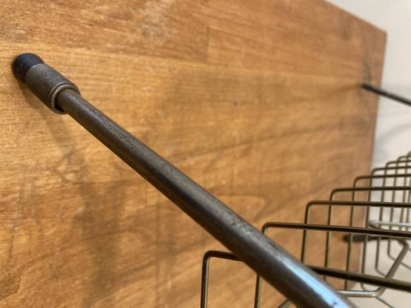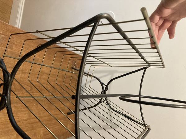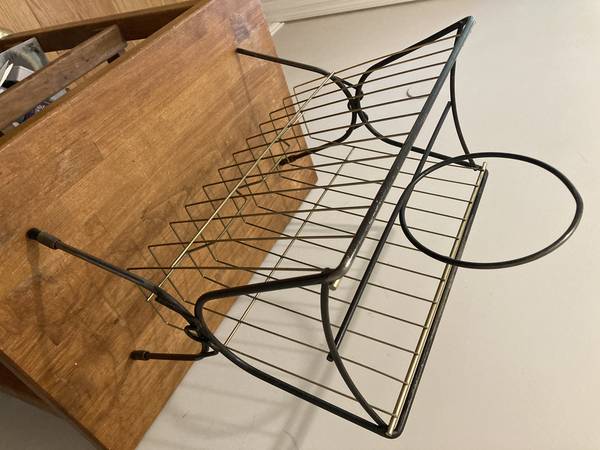 Mid Century Rack Storage Metal. 21" tall x 9 4/8 deep and 18 1/4" wide. One foot is missing coil and cap on foot. Gold colored inside wire basket (movable) and outside is black. I live close to south county mall in Oakville. I prefer text or call please, thanks.