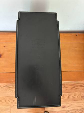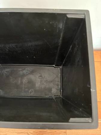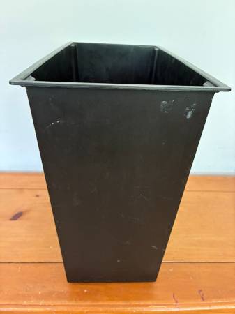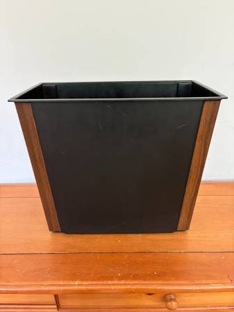 Mid Century Trash Can /Bin Plastic Black w/Wood Grain Look front panels in corners. 14 1/8T x 8 3/4W x 16 3/8D. Few white marks. I live close to south county mall in Oakville. I prefer text or call...