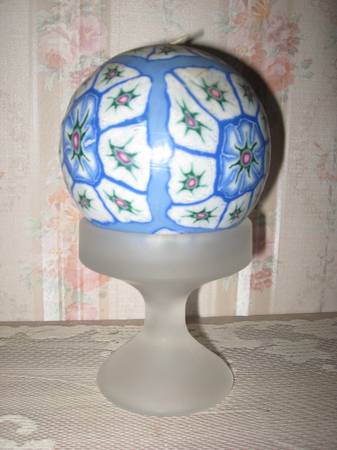 Approximately 4 1/2 inch diameter blue mille fleurs ball candle with frosted glass holder, $3.00. Local pick up in South St. Louis city, 63109.