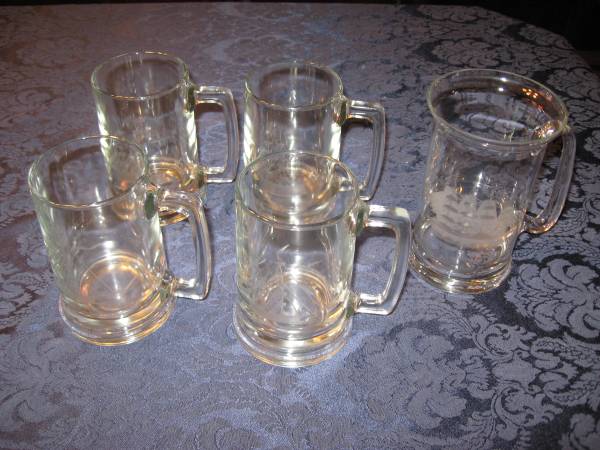 Five etched glass Clipper Ship beer steins: four matching (Javit crystal by Leonard Clipper Collection 15 ounce tankards,) plus one with flared lip, $25.00.