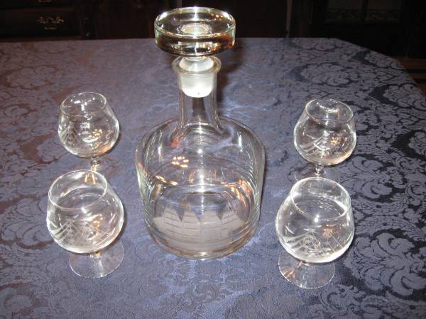 Etched glass Clipper Ship decanter with four matching brandy glasses, $25.00.