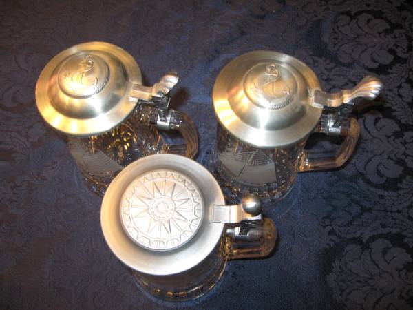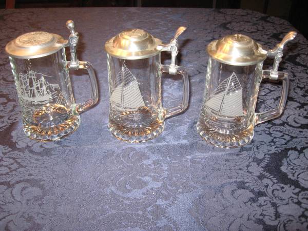 Three decal clipper ship and sailboat beer steins made of heavy glass with pewter-look lids, $15.00.
