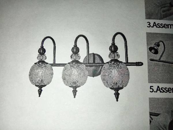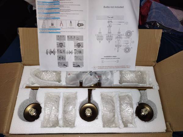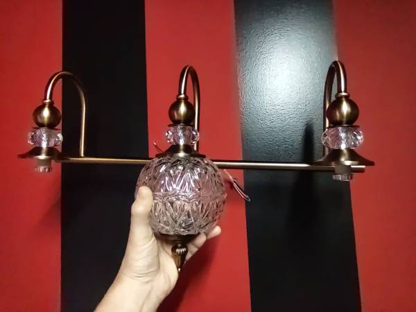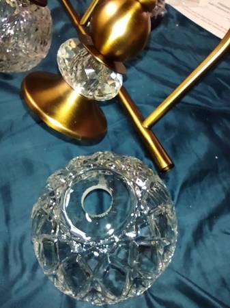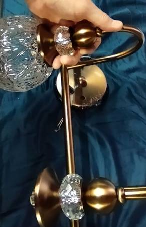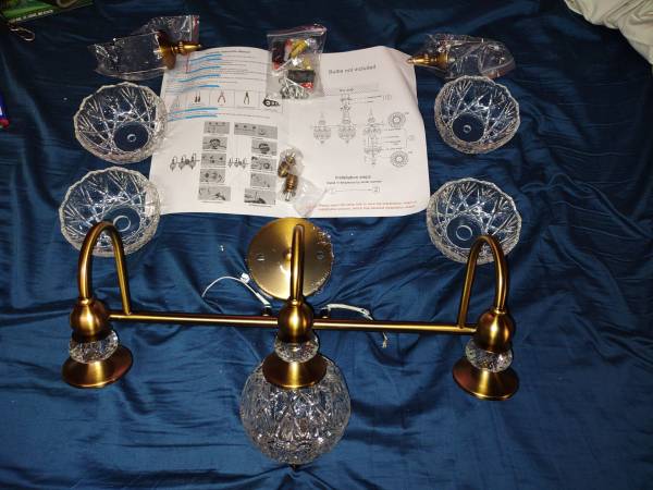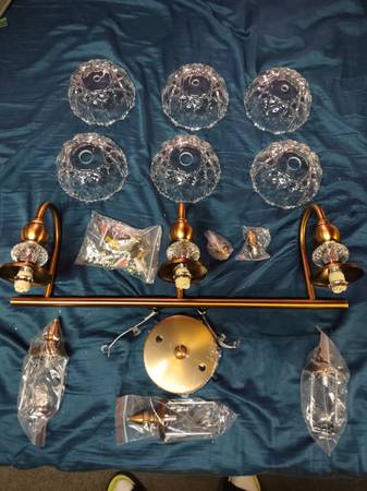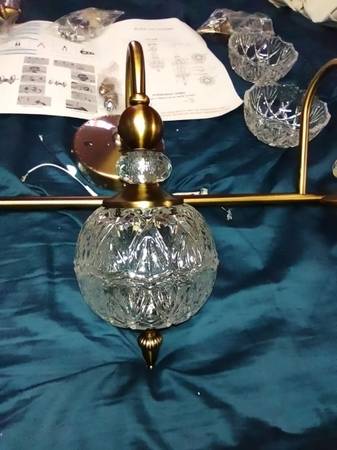 Brand new, complete, unused, with instructions included. Only taken out of the box for pictures. I only put one of the three crystal globes on for the pictures. Very nice fixture. Very solid.
