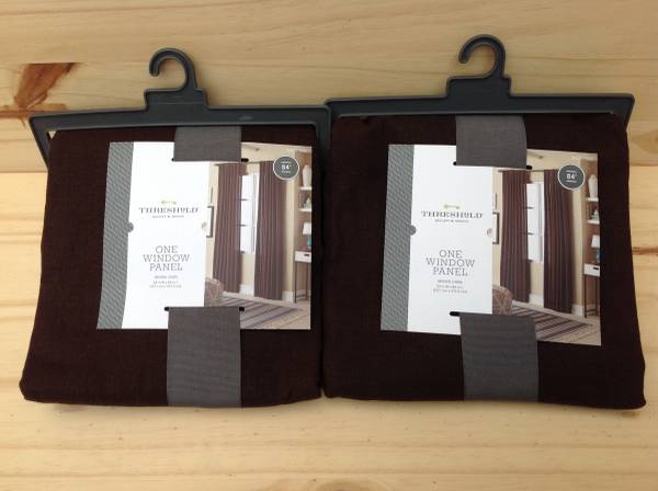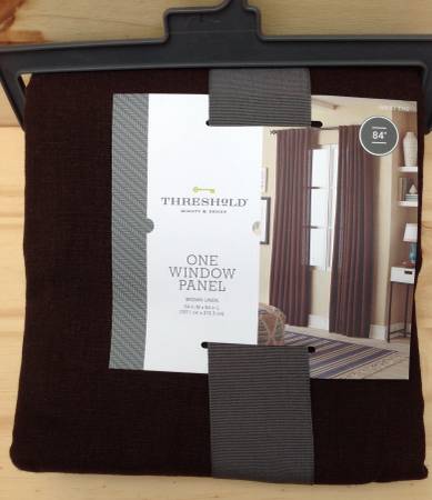 Two new, still in original packaging Threshold brand (Target) 84” curtain panels in a rich chocolate brown. They are a 55% linen/45% rayon blend. Full measurements are 54”W x 84”H. They have the rod pocket hanging style though you can certainly use the clip-on rings instead. These have a really nice heft and texture.