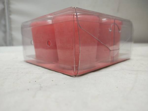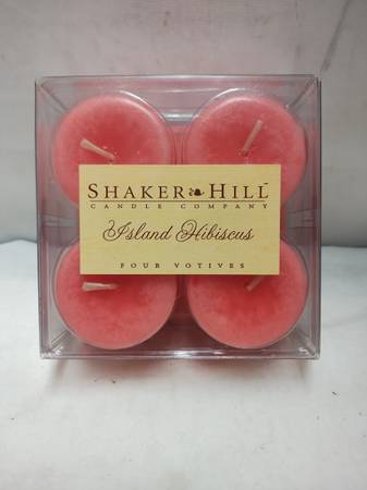 One box of four brand-new Shaker Hill Candle Company votive candles, unopened in original packaging. The candles are a marbled pink color and are island hibiscus scented, with wicks that are about 1/2-inch in length. Votive candles should be burned in votive holders for safety; votive holders are NOT included with this product.