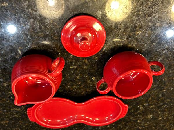 fiesta ware red sugar bowl and cream pitcher with tray $20.00