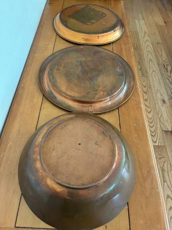 Vintage 2 Copper Plates Solid and 1 Tin Lined Bowl.