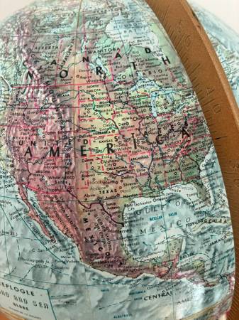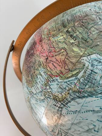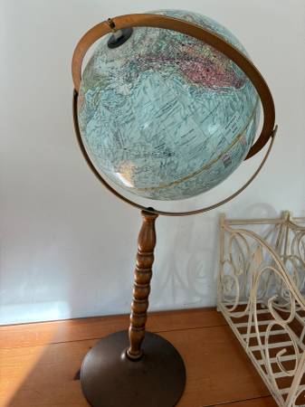 World Globe Vintage 30" Tall 12" Diameter Raised Relief Globe Wooden Pedestal on 10" diameter Metal Base has few scratches and raised area (pedestal and globe has wiggle /movement). I live close to south county mall in Oakville. I prefer text or call please, thanks.