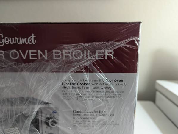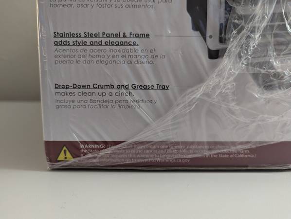 -Stainless steel silver/black frame with backing rack, bake pan and drop down crumb/grease tray.