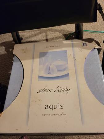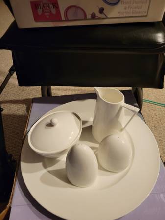 Salt and Pepper set, Sugar bowl with lid and 12" round platter. Never used. Microwave and dishwasher safe. Pick up in Waterloo. POOS