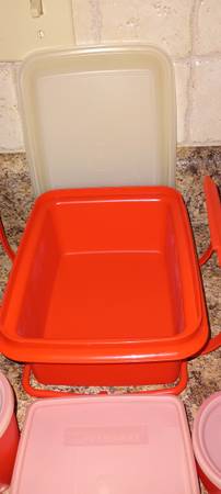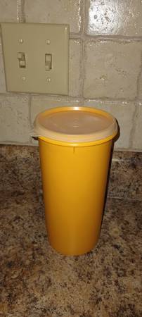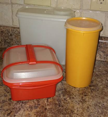 Offering a lot of discontinued Tupperware items today. You get a yellow gold juice canister with lid, a sheer cereal storage container with large opening lid for easy pouring, and a 9-piece handled lunch box...