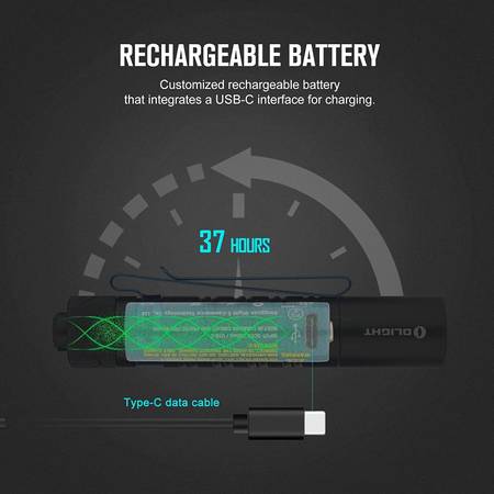 Rechargeable Battery: Customized rechargeable battery that integrates a Type-C interface for charging. Enough power for 37 hours of use on 15 lumens after fully charged. (Notes: Type-C charging interface for battery instead of flashlights).