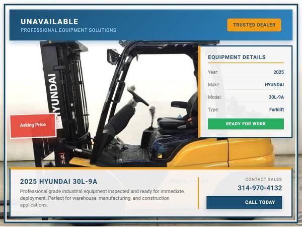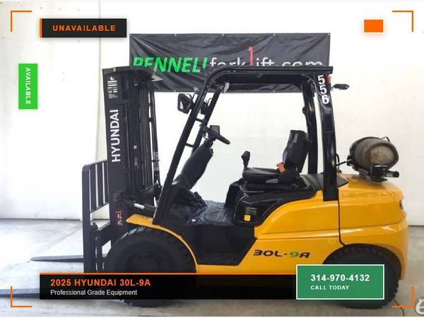 PICTURE 13 SPECIFICATIONS: Make/Model: Hyundai 30L-9A Year: 2025 Lift Capacity: 6,000 lbs Fuel Type: LP Gas Subcategory: Pneumatic Tire 4 Wheel Sit Down Mast Configuration: Three Stage Mast Height: 86 / 185 in Side Shifter: Equipped Operating Hours: 2 Condition: New Stock Number: HYU556 Additional Notes: Serviced And Ready!!