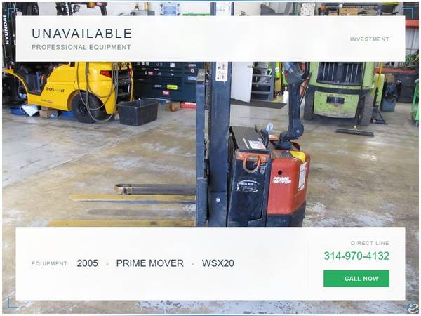 PICTURE 7 SPECIFICATIONS: Make/Model: Prime Mover WSX20 Year: 2005 Fuel Type: Electric Subcategory: Electric Walkie Straddle Stacker Reach Mast Height: 2 / 104 in Side Shifter: No Operating Hours: 9,263 Condition: Used Stock Number: PRI040 Additional Notes: Serviced and Ready!