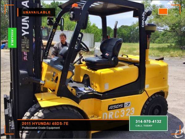 PICTURE 14 SPECIFICATIONS: Make/Model: Hyundai 45DS-7E Year: 2011 Lift Capacity: 10,000 lbs Fuel Type: Diesel Subcategory: Pneumatic Tire 4 Wheel Sit Down Mast Configuration: Three Stage Mast Height: 93 / 185 in Side Shifter: Equipped Operating Hours: 3,096 Condition: Used Stock Number: HYU428 Additional Notes: Being Serviced, Will Update Pictures Soon!!