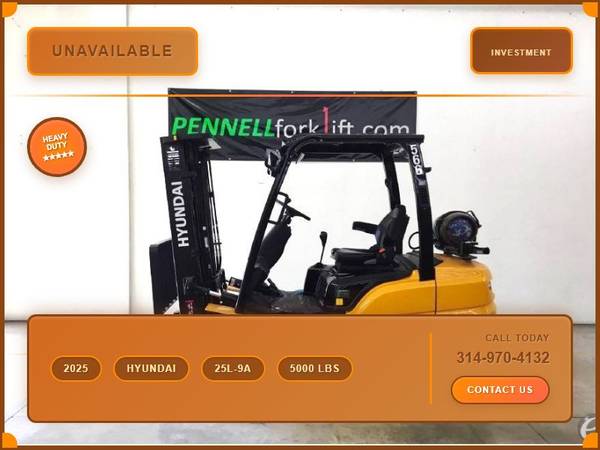 PICTURE 8 SPECIFICATIONS: Make/Model: Hyundai 25L-9A Year: 2025 Lift Capacity: 5,000 lbs Fuel Type: LP Gas Subcategory: Pneumatic Tire 4 Wheel Sit Down Mast Configuration: Three Stage Mast Height: 86 / 185 in Side Shifter: Equipped Operating Hours: 1 Condition: New Stock Number: HYU566 Additional Notes: Serviced And Ready!!