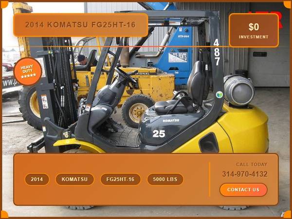 PICTURE 16 SPECIFICATIONS: Make/Model: Komatsu FG25HT-16 Year: 2014 Lift Capacity: 5,000 lbs Fuel Type: LP Gas Subcategory: Pneumatic Tire 4 Wheel Sit Down Mast Configuration: Three Stage Mast Height: 80 / 170 in Side Shifter: Equipped Operating Hours: 5,571 Condition: Used Stock Number: KOM487 Price: $0 Additional Notes: AMBER STROBE, BUALM, RV MIRROR, COTTON CORE RADIATOR, LOWERED OHG, 4 WAY VALVES