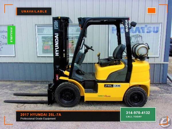 PICTURE 22 SPECIFICATIONS: Make/Model: Hyundai 25L-7A Year: 2017 Lift Capacity: 5,000 lbs Fuel Type: LP Gas Subcategory: Pneumatic Tire 4 Wheel Sit Down Mast Configuration: Three Stage Mast Height: 86 / 185 in Side Shifter: Equipped Operating Hours: 1,695 Condition: Used Stock Number: HYU460 Additional Notes: Nice Low Hours Used Unit!!