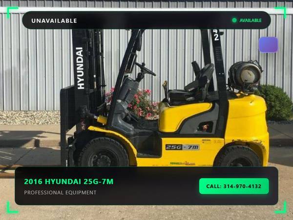PICTURE 15 SPECIFICATIONS: Make/Model: Hyundai 25G-7M Year: 2016 Lift Capacity: 5,000 lbs Fuel Type: Dual Fuel Subcategory: Pneumatic Tire 4 Wheel Sit Down Mast Configuration: Three Stage Mast Height: 86 / 185 in Side Shifter: Equipped Operating Hours: 1,899 Condition: Used Stock Number: HYU542 Additional Notes: Updated Pictures To Follow!!