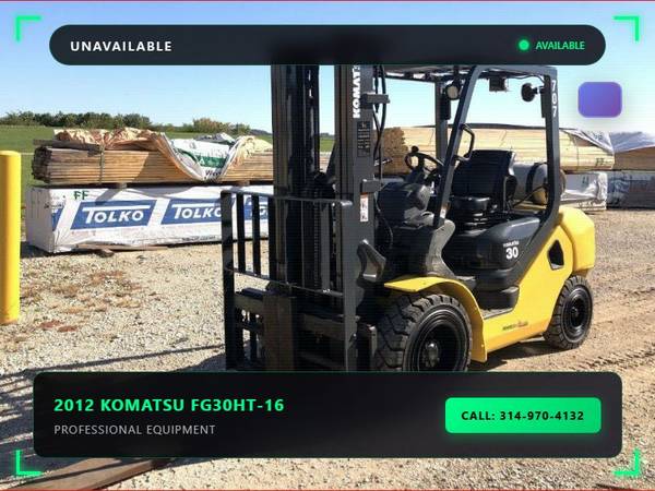 PICTURE 4 SPECIFICATIONS: Make/Model: Komatsu FG30HT-16 Year: 2012 Lift Capacity: 6,000 lbs Fuel Type: LP Gas Subcategory: Pneumatic Tire 4 Wheel Sit Down Mast Configuration: Three Stage Mast Height: 85 / 183 in Side Shifter: Equipped Operating Hours: 8,847 Condition: Used Stock Number: KOM707