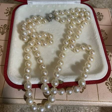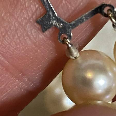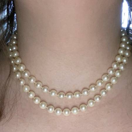14k white gold double strand Pearl necklace. Hallmarked 14KG on the clasp. Genuine white pearls, this is a heirloom piece. Measures 15.5" & 17" long. Appraised by my jeweler for $500!