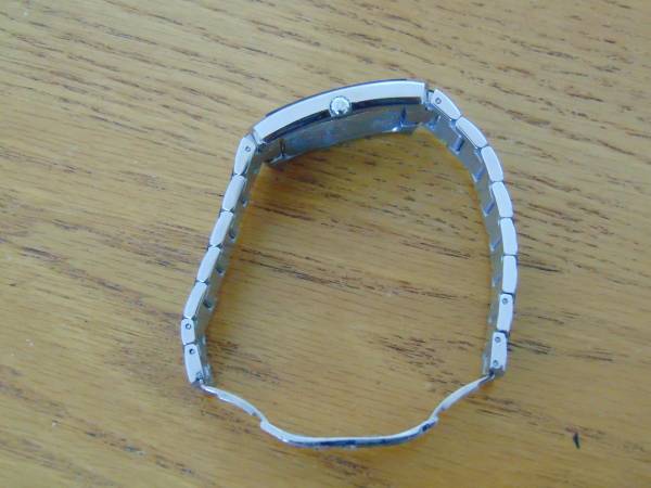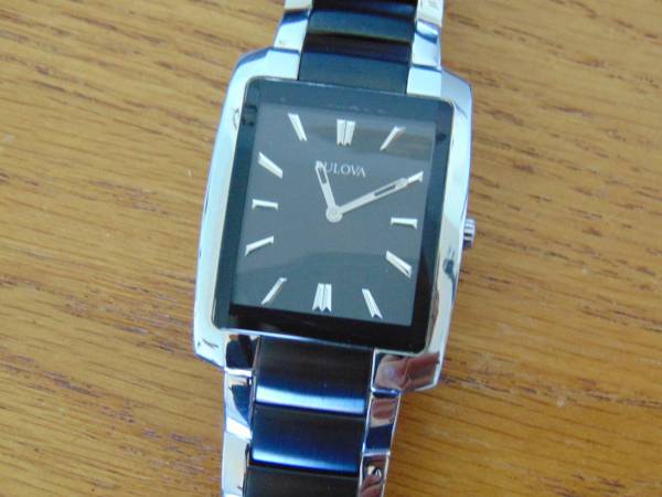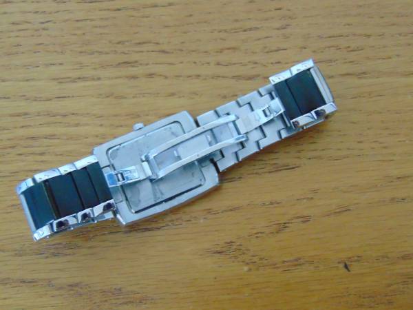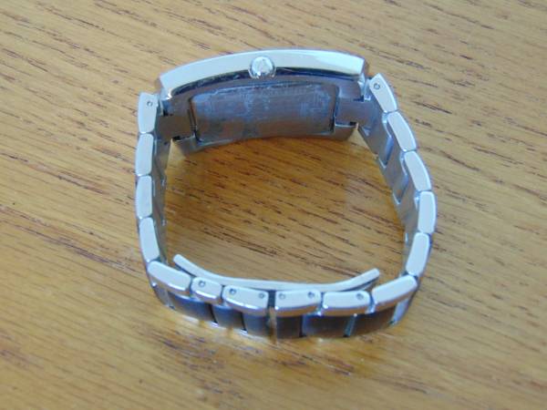 Nice dress watch in used condition. Polish stainless steel and black. Rectangular case with hidden clasp. Japanese Quartz movement never loses time. Wear something different on your wrist!