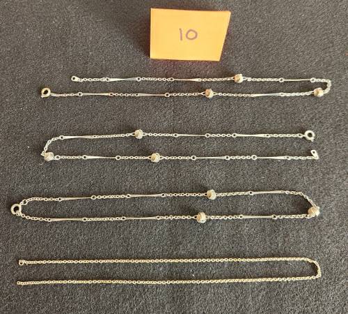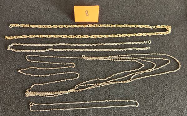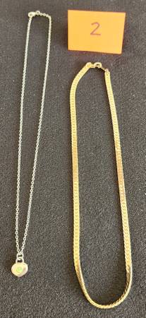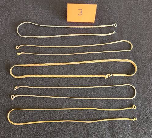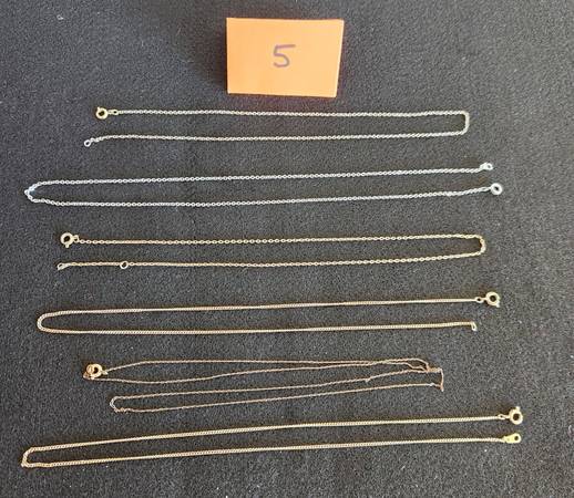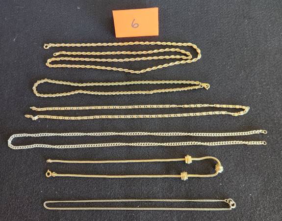 This is an assortment of necklaces and chains jewelry. Most are in good condition with only a few needing repair or showing signs of wear. They are shown in groups and are priced individually at $2 per piece. Most have no markings. Detailed photos of any piece may be obtained on request.