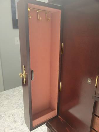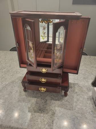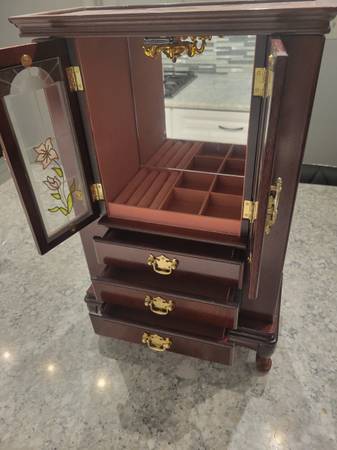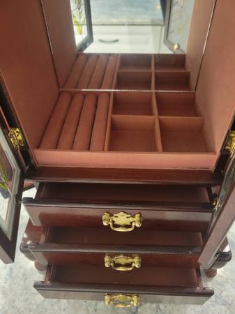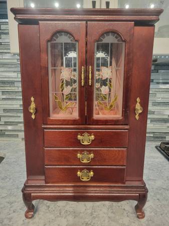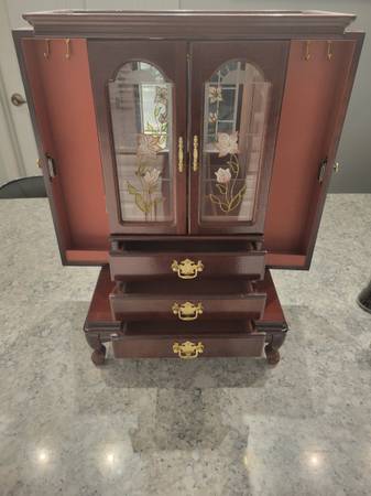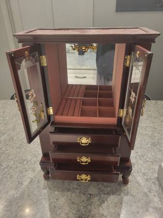 Nice jewelry case in great condition with plenty of storage for your rings, earrings, hooks for necklaces and drawers for additional items. 21H x 13W x 7D. Call/ text Brian
