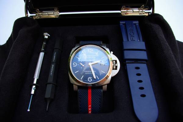 The Panerai line is one of my favorite watch brands. It's swiss movements are among the best in the world, but what sets them apart is their unique crown guard. As you will see from the photos it is quite stunning and in very good conditions. The photos show any imperfections. Also from the photos you will see it comes with inner & outer boxes, both is perfect condition. It comes with the trademark tools, booklet, papers & an extra new Panerai band in blue to match the watch face. The band on the watch shows virtually no signs of wear. I regularly am asked by "watch guys" what is that on my wrist? It is really beautiful and eye catching!