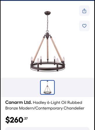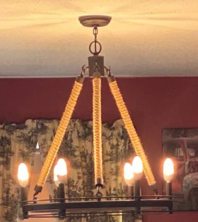 6-Light Oil Rubbed Bronze Modern/Contemporary Chandelier - Rope & Bronze used for a short time - currently selling for $260 plus taxes - selling for a great price - 26”Tall x 23.25 Wide without chain - $75.00