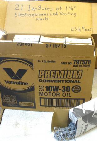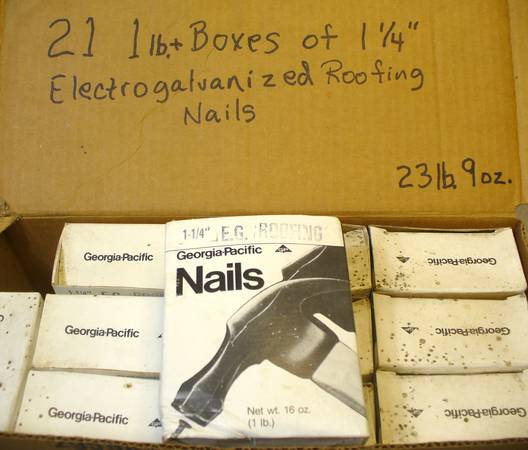 21 1lb.+oz. boxes of 1 1/4 inch Electogalvanized Roofing Nails. Total weight of 23lb. 9+oz. $60. Please text / call 9am.-8pm. Three one 44 zero 2 zero 24 nine.