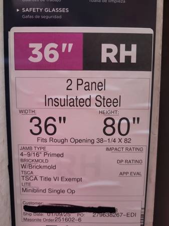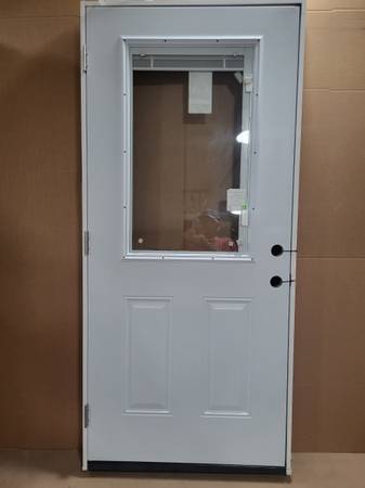 Have one new MASONITE (model#741077) 36-in x 80-in x 4-9/16-in steel half-lite right-hand inswing primed prehung entry door with brickmould with blinds between dual panes of Low-E glass. Features include: Raise, lower, and tilt miniblinds that can add privacy to any home; Smooth, primed surface ready to paint, with wood frame; M-Protect Multi-Point Lock surpasses one of the highest levels of industry benchmark tests for security; High quality baked on primer that is ready to paint and helps to prevent rust and corrosion; Reinforced steel lock plate applied to the latch side jamb for added security; Double bored for easy installation of handle set and deadbolt lock; A high-performance polyurethane foam insulated core that helps save energy. Retails for $498+tax, asking $290. Please call or text Allan (3one4) 610-1917, thanks.