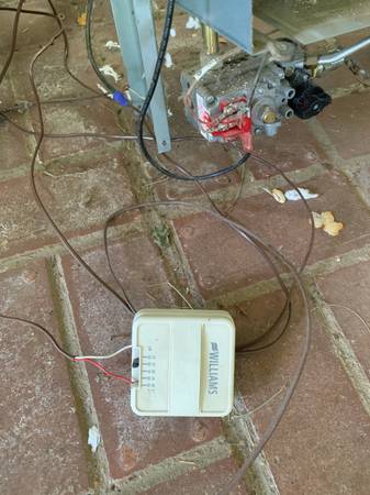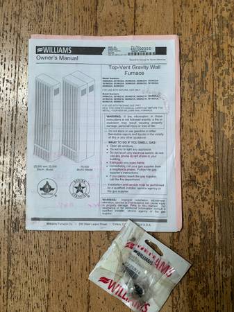 Williams TOP-vent Gravity Wall Furnace. 35000 BTU. same model for sale at big box stores for $1000 plus this has the optional top-mounted blower fan and thermostat wired. Also an extra vent limit - ours went out and they shipped two. Auto pilot. Also includes the "as-is" top vent to go though the roof.