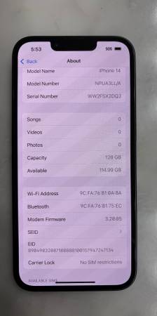 iPhone 14 unlocked for any carrier and in like new condition. Phone battery health is still at 100%.