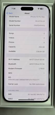iPhone 15 Pro Max unlocked for any carrier. Phone is in like new condition and has no scratches or scuff marks anywhere on body or screen. Phone comes with a clear Apple case, original box and...