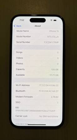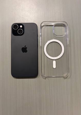iPhone 15 like new condition and unlocked for any cell carrier. Battery health is still at 100%. Phone comes with a case and charging cable.