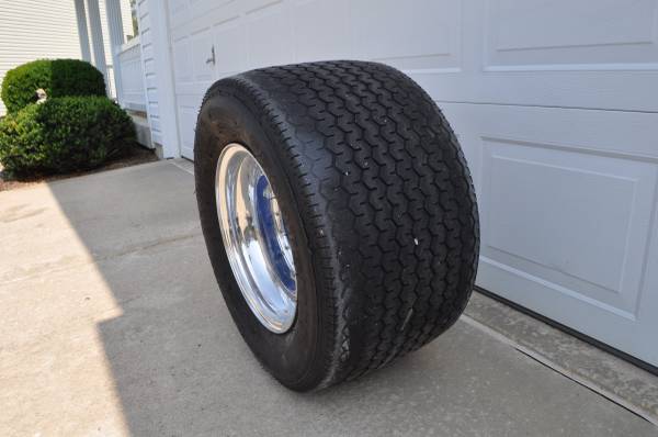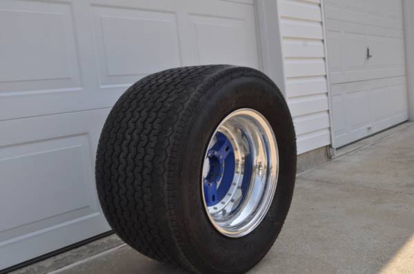 Wheel is a 3-piece, 15" diameter and 12" wide. The tire is a Mickey Thompson Sportsman, 29 X 15.5 X 15.