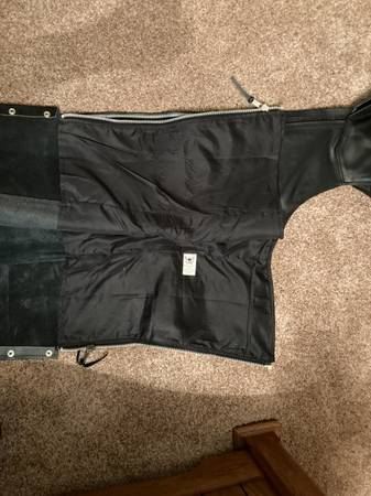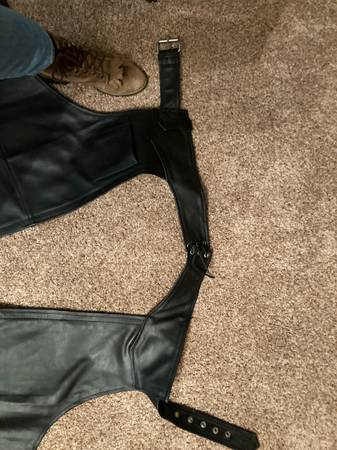 This is a pair of ladie's black leather chaps. This pair has no wear, cracking, sweat, or wrinkles. It will fit a woman 5'4" or near that (can be cut off for shorter women). They have been stored inside in a closet. These have a polyester liner. Size Medium.