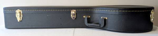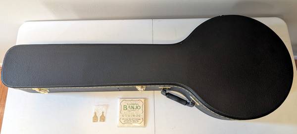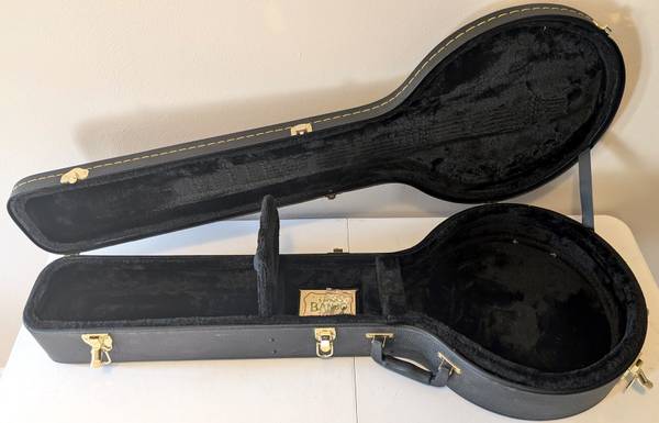 "This banjo case is designed to fit all standard 4- and 5-string banjos. Features textured black vinyl covering, 5-ply wood construction, black plush lining, gold-plated hardware, interior accessory compartment, and locking fasteners."