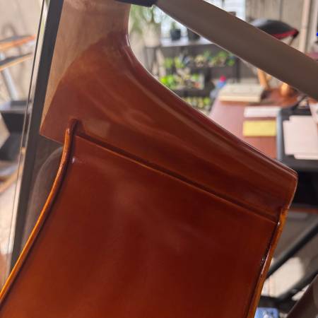 Full setup and new strings installed by St. Louis Strings in the spring of 2025. No cracks or open seams. Small dots on the side of the fingerboard to mark note positions in the first octave.